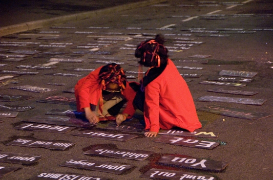 As part of the project Sofie designed the installation and performance elements to the piece. The five ways underpass installation – printed sleeping bodies on plastic and silk. Silk roses grew out of concrete paving stones and children played in empty streets.